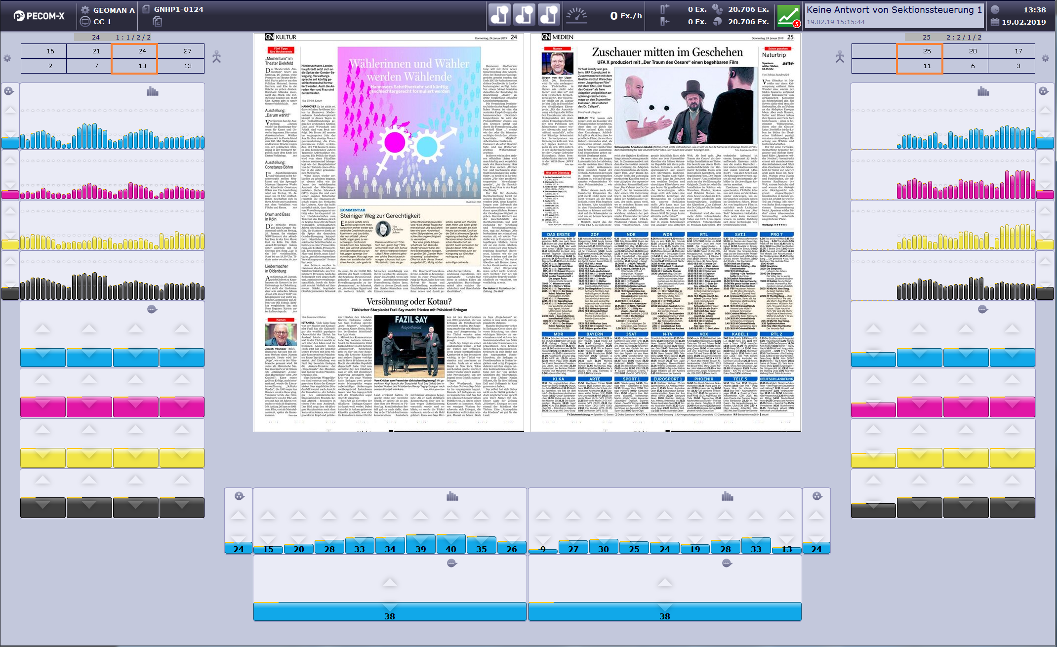 Die ControlCenter-Oberfläche wurde an den bestehenden Leitständen implementiert, das „alte Möbel“ einschließlich der eingelassenen Tastaturen blieb erhalten. Ergänzt wird die Steuerung künftig durch das zentrale ControlPad - einem Touch-Bildschirm. Dieser visualisiert und steuert alle integrierten Komponenten und zeigt ihren aktuellen Status – somit sind alle produktionsrelevanten Informationen in Echtzeit zentral einsehbar. Korrekturen der Einstellungen werden direkt am Touchscreen vorgenommen. Ebenso ist es nun möglich, eine Ferndiagnose durch das MGWS TeleSupport Center (TSC) durchzuführen.