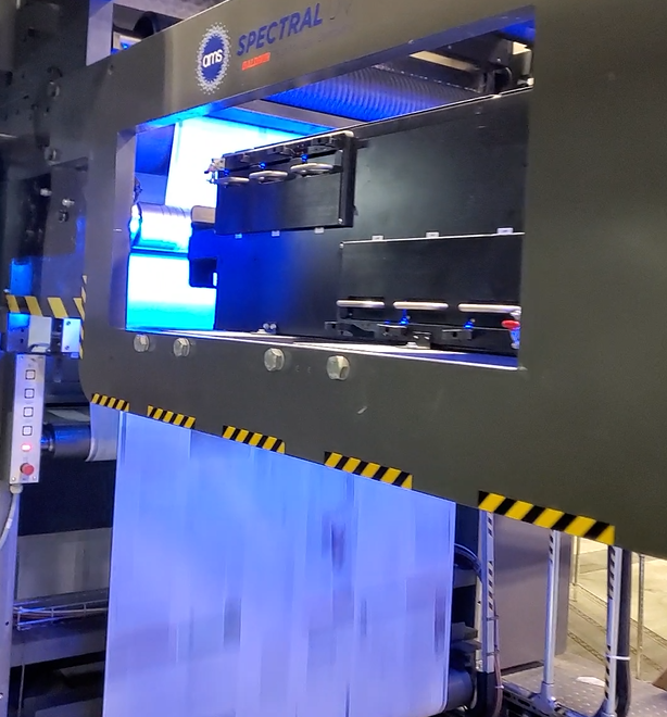 Die Anlage ist mit vier Doppeldruckwerken ausgestattet und druckt mit hochwertiger und mineralölfreier UV-Farbe. Ein weiterer Vorteil der LITHOMAN IV: anstelle eines herkömmlichen Heißlufttrockners verwendet manroland Goss einen UV-Trockner. Dank der UV-Trocknung wird die Papierbahn nicht erhitzt und muss im Anschluss nicht, wie bei konventionellen Maschinen mit Heißlufttrocknern, durch Kühlwalzen abgekühlt werden. So spart die UV-Trocknung Platz: der Kühlwalzenbaustein entfällt und vereinnahmt ca. 40 Prozent weniger Fläche als dies bei einer herkömmlichen Druckanlage der Fall ist.